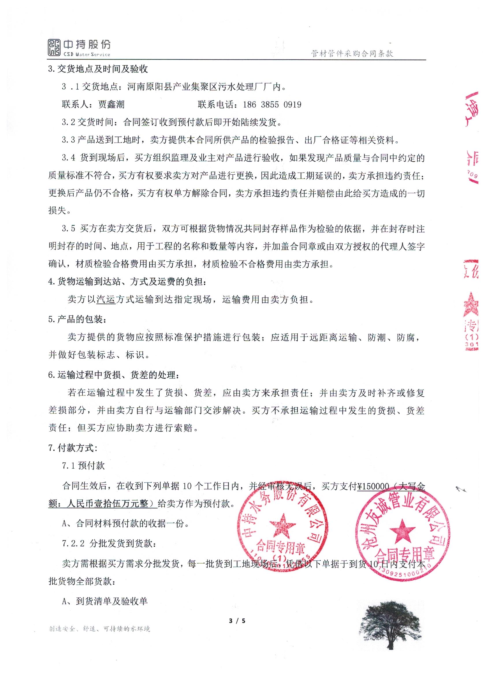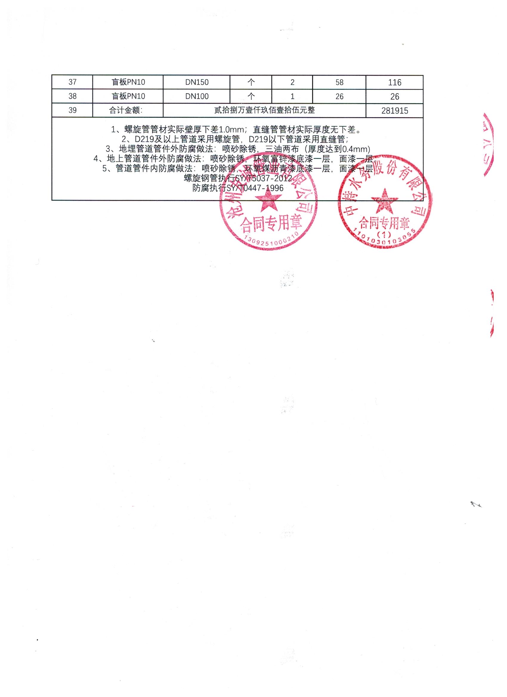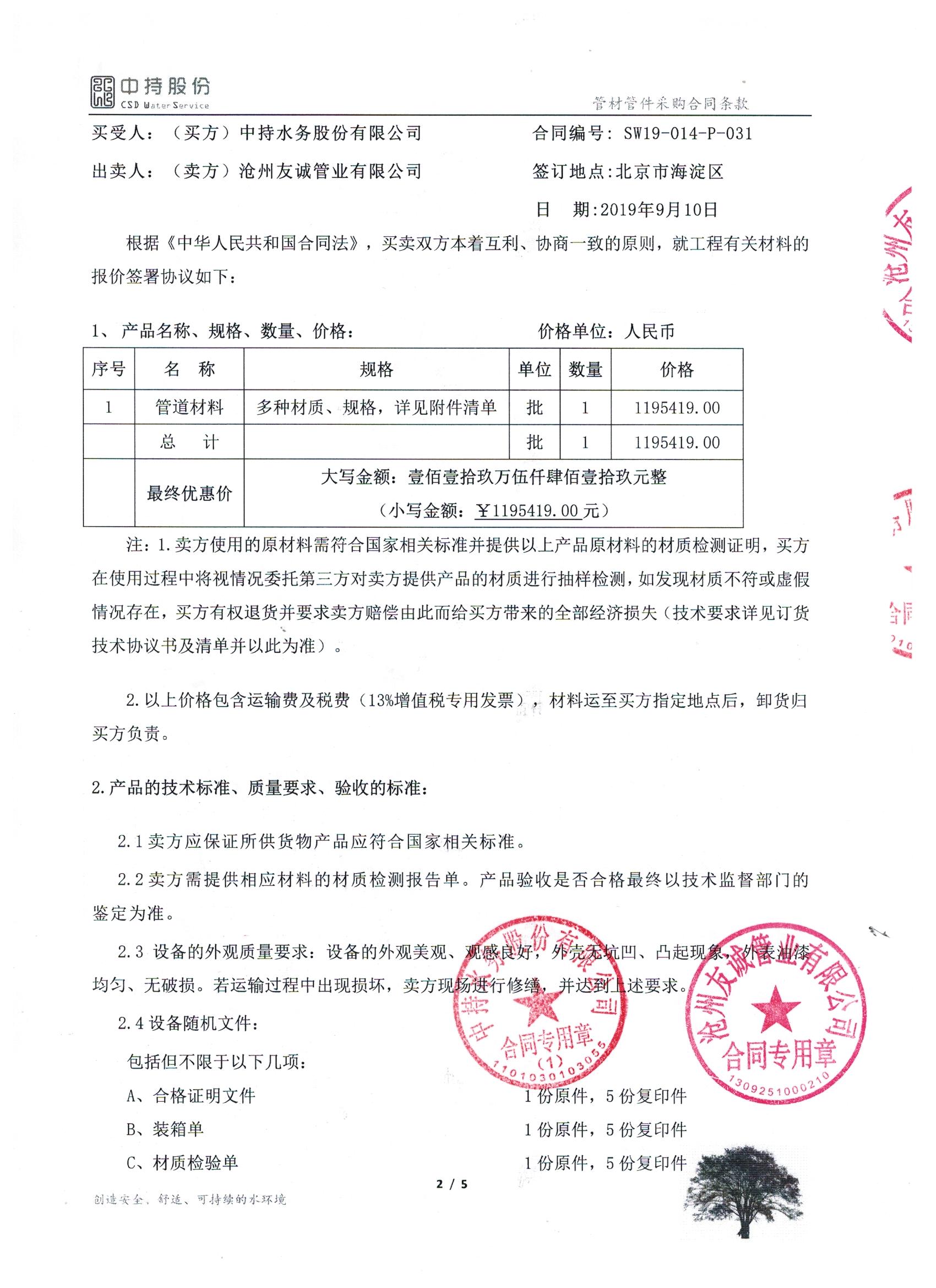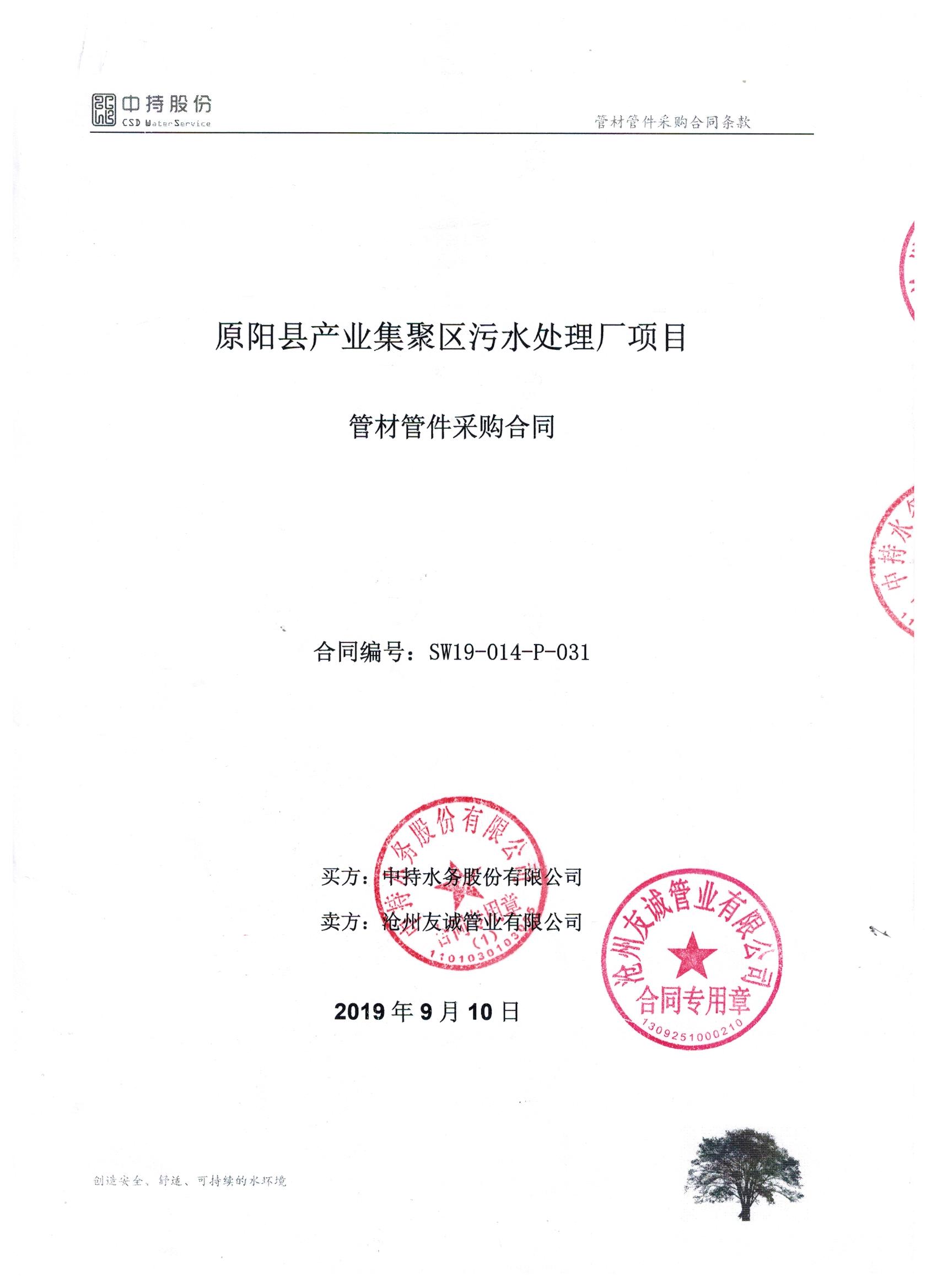 2019年9月份,友誠管業(yè)與中持水務股份有限公司(上市公司),簽訂了原陽縣污水處理廠項目的防腐螺旋鋼管合同,非常感謝貴公司對我們的信任,我們也一如即讓的做好每一支鋼管.